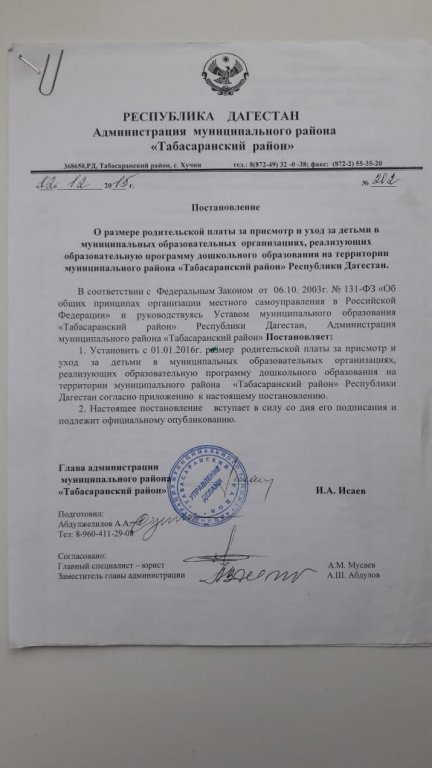 Документ об установлении размера платы, взимаемой с родителей (законных представителей)